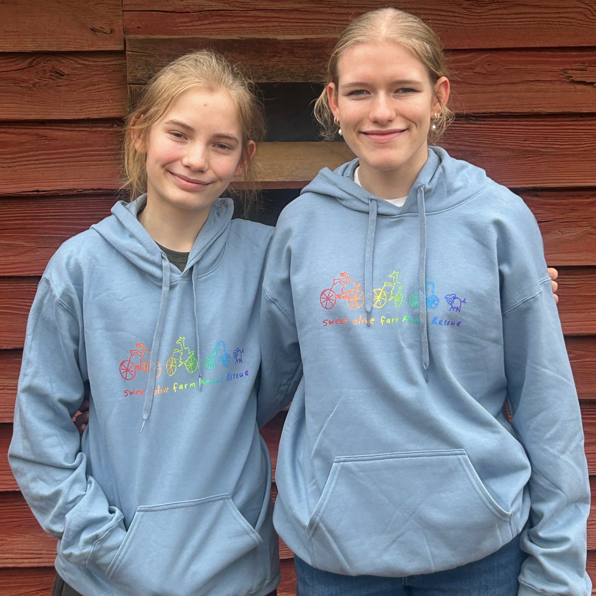 Ready to look cool and stay warm? Our hoodies are back!!! This time with Rainbow font on a light blue hoodie. All proceeds go to supporting the animal rescue